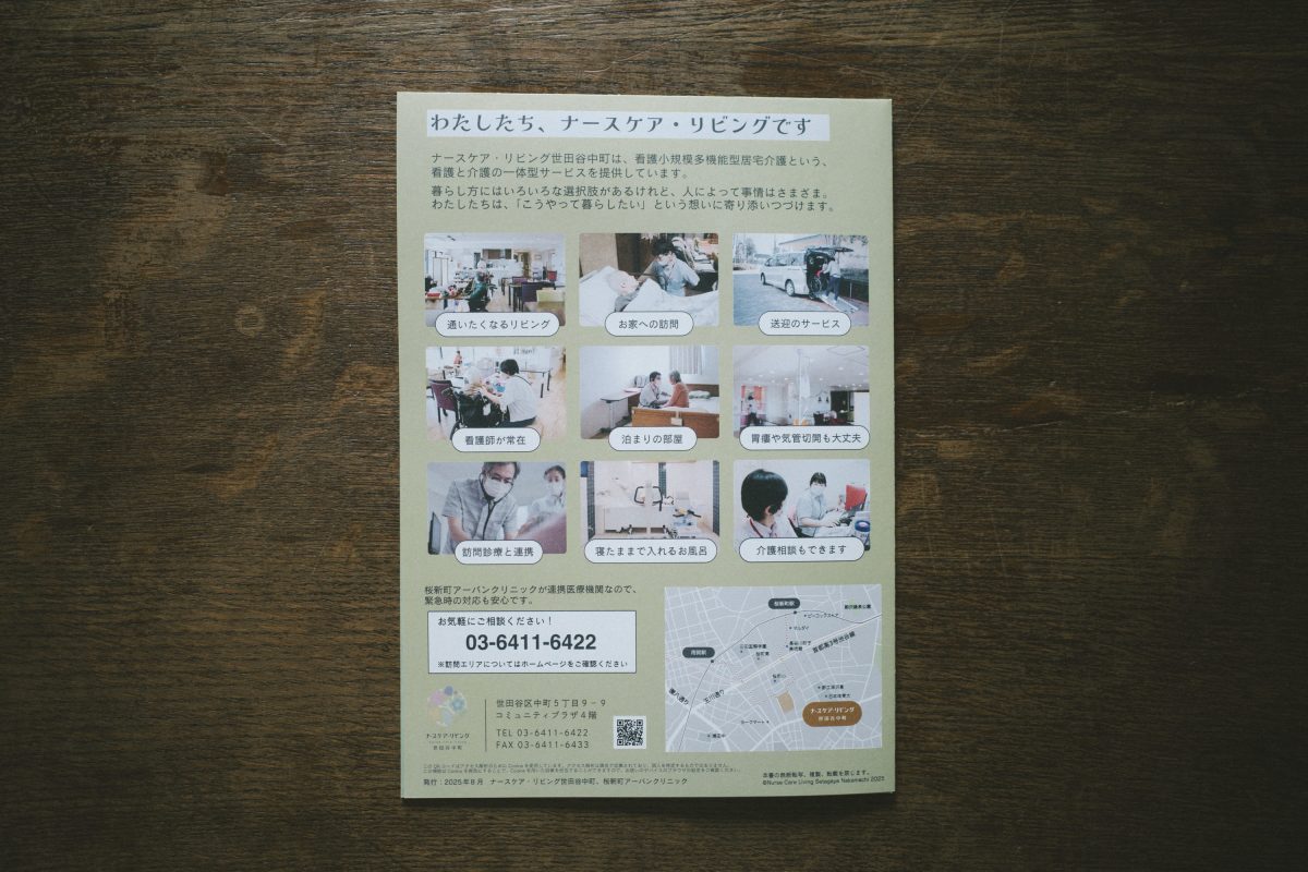 この冊子は、 ナースケア・リビング世田谷中町のケアスタッフや、桜新町アーバンクリニックの医療スタッフ、わたしたちが訪問させていただいている利用者のみなさんからの声を集めたものです。